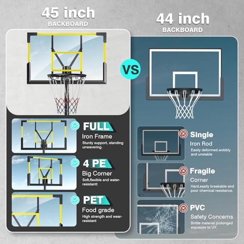 Shatterproof PC Backboard: Our basketball goal system is equipped with 18″ size basketball rim and all-weather nylon net, 45 inch backboard to bring you a wonderful sports experience. And the basketball stand surface coated with rust resistant materials to make it, use high strength steel provide exceptional stability and solid
