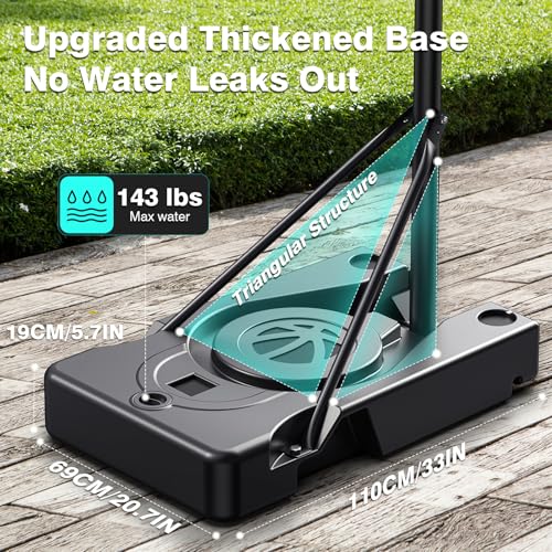 Portable & Sturdy Fillable Base: The base built-in 2 wheels, making it easy for you to move the hoop around, you can place it in backyards, basketball court, gyms, swimming pool and other indoor and outdoor places. This Outdoor Basketball Hoop Stand is equipped with a triangular support structure provides exceptional stability during play, the base uses PE material, fill it with 143 lbs water to ensure stability of the base. It is more recommended to use sand to fill the base