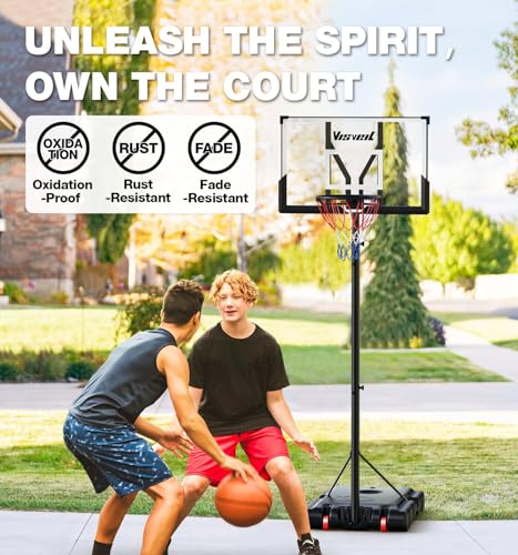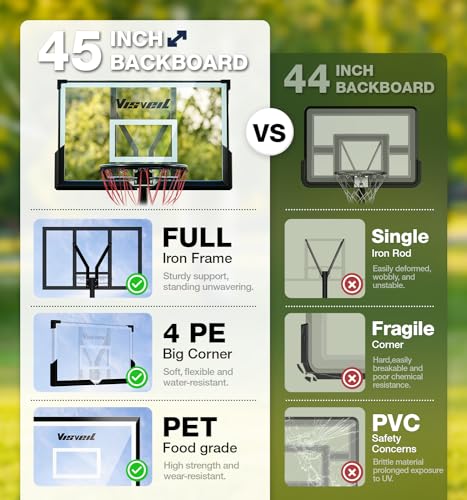 Adjustable Basketball Hoop for All Ages:The VISVEIL Basketball Hoop system boasts a 45-inch backboard with 12 adjustable height settings from 5.7FT to 10FT, the VISVEIL basketball system is designed to grow with you, from childhood to adulthood to fulfill your basketball aspirations