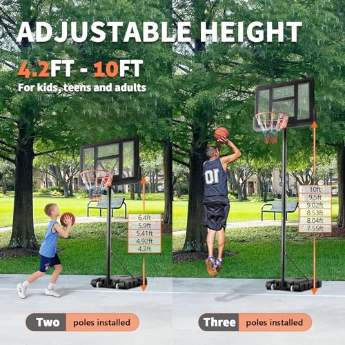 【Ideal Basketball Hoops】The DUMOS Basketball Hoop is perfect for both indoor and outdoor use . It ‘ s a portable and adjustable system that can be utilized by children and adults of different ages , with height adjustment from 4.2 feet to 10 feet , making it perfect for family fun.