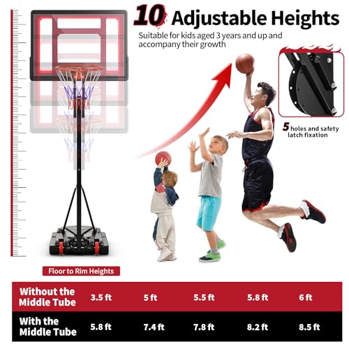 [10 Adjustable Heights]: Giantex basketball hoop features 5 holes and safety latch fixation for easy height adjustment. The floor to rim heights are available in 10 positions: 3.5ft, 5 ft, 5.5 ft, 5.8 ft, 6 ft (without the middle tube); 5.8 ft, 7.4 ft, 7.8 ft, 8.2 ft, 8.5 ft (with the middle tube). This adjustable basketball goal is suitable for kids aged 3 years and up and accompany their growth.