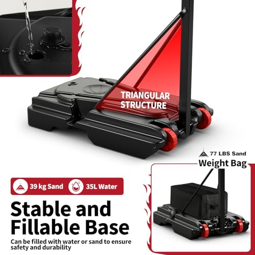 [Stable & Fillable Base with Weight Bag]: The stable and thickened base with triangular support ensures stability and prevents tipping over. It can be filled with 9.2 gallon water or 86 lbs sand for added stability. Moreover, the weight bag can be filled with 77 lbs sand for enhanced stability. Plus, the built-in round recess on the base perfectly holds the ball without it rolling away.