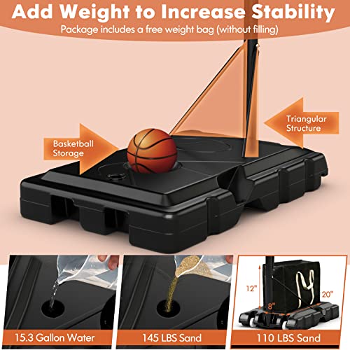 [ Add Weight to Increase Stability ]: The solid PE base can be filled up to 143.3 lbs sand or 15.3 gallon water to ensure better stability, avoiding tip-over accidents during every shooting. Besides, you can add included hoop secure bag with sand (holding up to 110 lbs sand) and put the bag on the base, which is more convenient and easier to maintain.