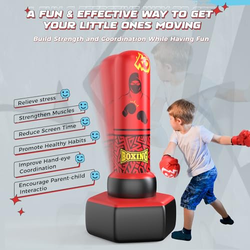 Perfect Gift for Kids: This 67-inch red freestanding punching bag comes with boxing gloves and a manual pump. The punching bag set is the ideal birthday or Christmas gift for kids aged 4-12, especially for kids who enjoy martial arts, karate, or taekwondo