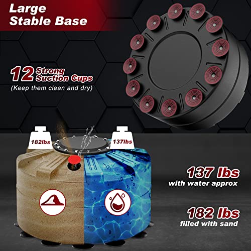 𝐒𝐭𝐚𝐛𝐥𝐞 𝐅𝐥𝐨𝐨𝐫 𝐒𝐮𝐜𝐤𝐢𝐧𝐠 𝐁𝐚𝐬𝐞 – ABS Circular Base can hold up to 137 pounds of water or 182 pounds of sand. It is equipped with 12 suction cups that firmly adhere to the ground, providing enhanced stability. Filling it with sand provides even more stability.