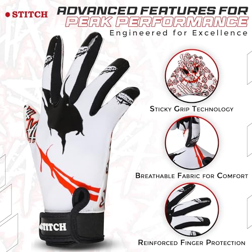☆ Heavy Duty Sticky Silicone Grip : Dot Stitch Jester football receiver gloves are designed with heavy duty sticky silicone grip which provides extra grip while playing game and moreover super perfect for nonslip. Back side joker face silicone print design on comfortable and stretchable material.