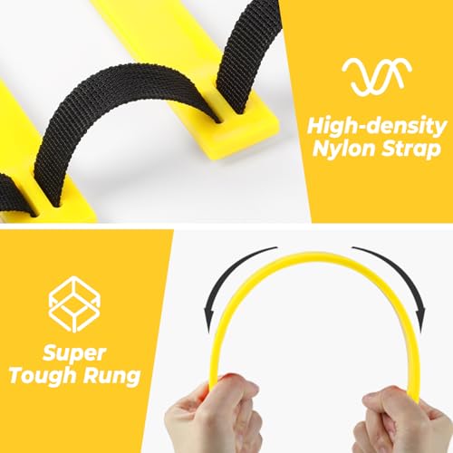Adjustable Agility Rung Design: Each rung is 16.5″ long, and the space between rungs is adjustable up to 15″ inch. You can simple adjust it in the nylon straps so as to meet your workout demands in grass ground or playground