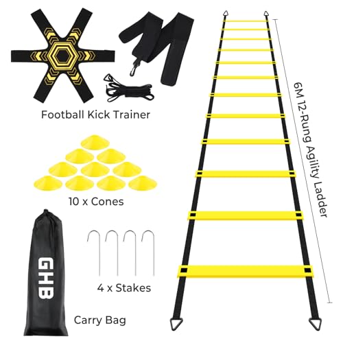 GHB Pro Agility Ladder Soccer Kick Trainer Set 20ft 12 Rung10 Cones and 4 Stakes Speed Agility Football Training Equipment with Carrying Bag