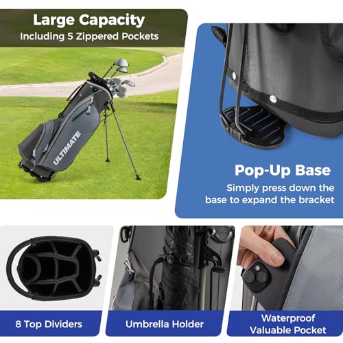 【Great Portability & Convenient Storage】The lightweight golf stand bag is fitted with a sturdy handle and adjustable shoulder straps, allowing you to carry it with ease. In addition, the stand bag is equipped with a lot of multifunctional pockets, so that you can keep your golf supplies and private items in an orderly and classified way.