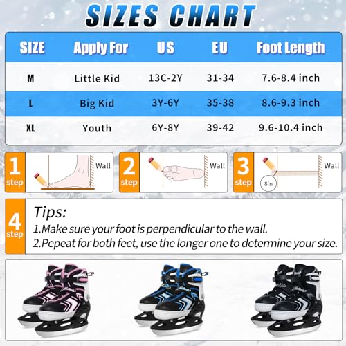 ADJUSTABLE ICE SKATES : We have 3 sizes S/M/L, each size has 4 gear adjustment which can satisfy your child to play for a few years. It’ ideal choice for your kids ice skates.